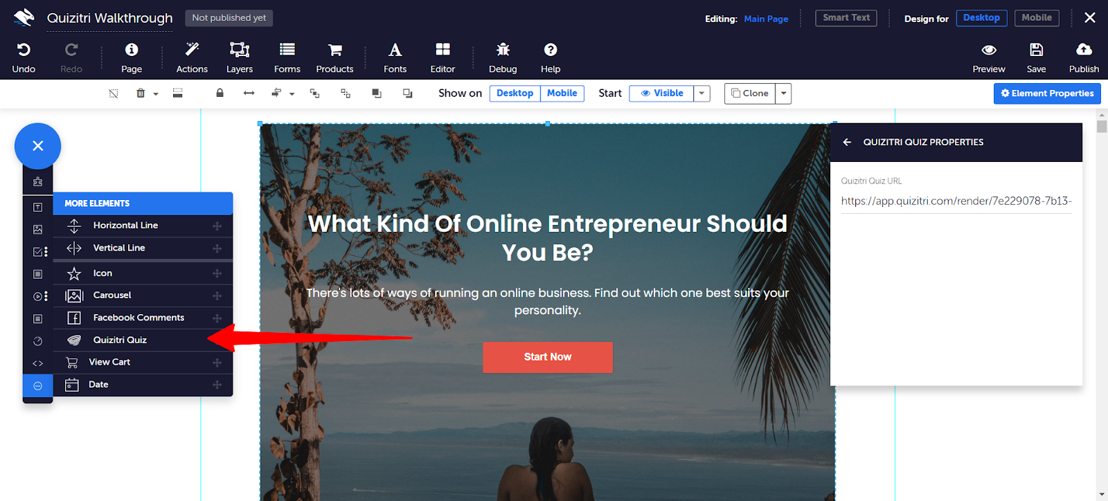 First, create your quiz in Quizitri (you can sign up for an account and use their drag-and-drop quiz maker to set up questions and outcomes). When your quiz is ready, publish it in Quizitri and copy the quiz URL.