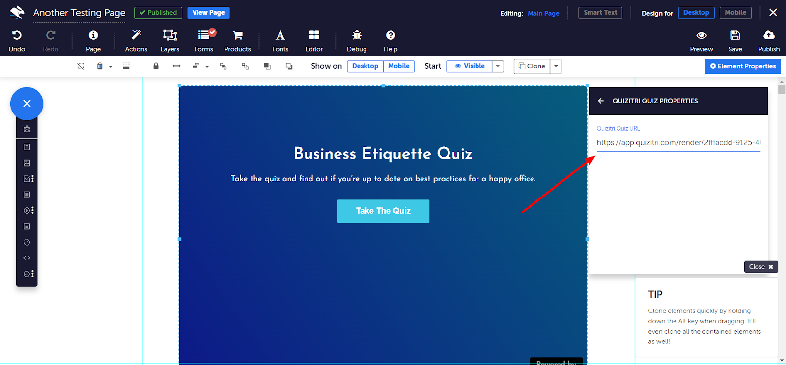 For example, add a headline like “Find Your Marketing Style” and an intro paragraph explaining the quiz benefits. Then, to actually include the quiz, use Convertri’s “Quizitri Quiz” element. Simply drag the Quizitri element onto the page, open its properties, and paste your Quizitri quiz URL. Convertri will embed the interactive quiz in your page.
