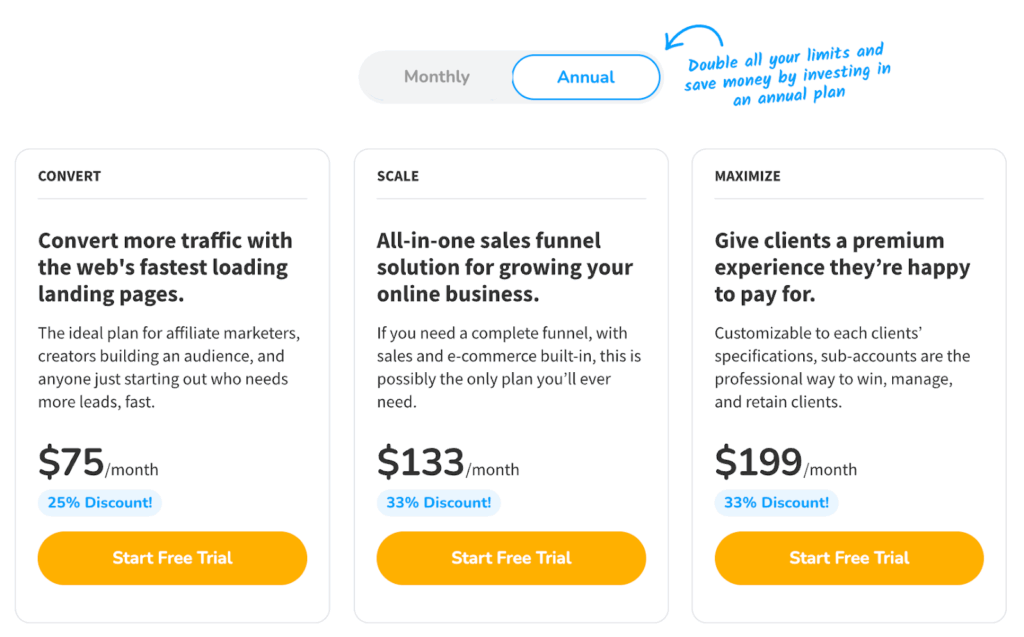 Convertri offers a pricing structure that’s transparent, flexible, and tailored to businesses at different growth stages. Whether you’re just starting with the Convert plan, scaling your funnels with Scale, or managing multiple clients on Maximize, Convertri gives you fast-loading pages, drag-and-drop freedom, and built-in tools that streamline your marketing. Annual billing can save you significantly, and the 14-day free trial lets you test everything risk-free.