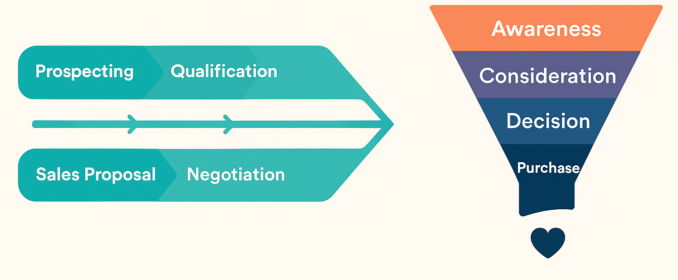 | Stages | Prospecting → Qualification → Sales meeting → Sales proposal → Negotiation → Closing deals. | Awareness stage → Consideration → Decision → Purchase → Customer retention. |